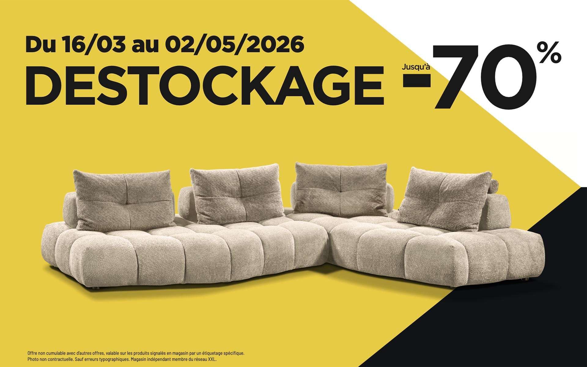 Déstockage exceptionnel chez maison XXL à Chennevières : du 16 mars au 2 mai 2026, profitez de promotions folles jusqu'à -70% sur nos canapés, meubles, chaises, tables basses et sur la décoration contemporaine ! Rendez-vous en magasin à Chennevières – les bonnes affaires partent vite, il n'y en aura pas pour tout le monde. Offre limitée – ne manquez pas cette occasion !